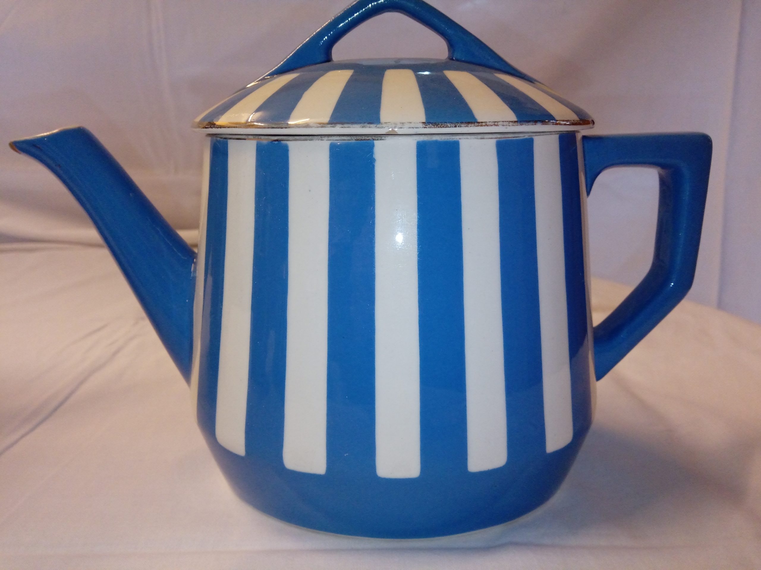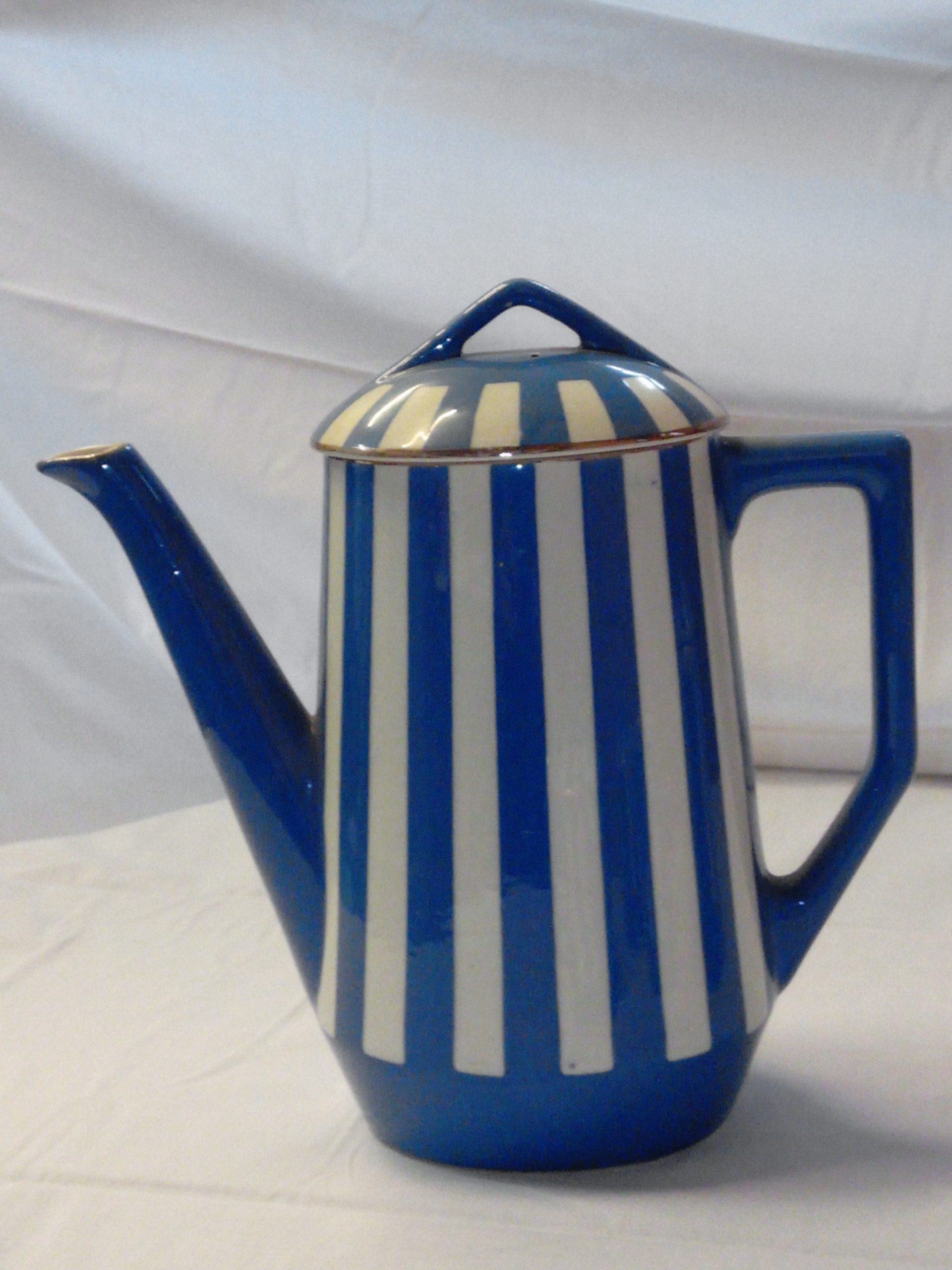 Fox Trott de Sarreguemines ! Le service emblématique de l’époque Art Déco, tant dans les lignes épurées des pièces de formes que dans le motif géométrique, sobre et élégant, de rayures bleu lumineux. La très belle qualité de la faïence révèle l’intensité et la pureté des couleurs. Mème le nom « Fox Trott » est emblématique des années folles. Chaque pièce porte la signature de la faïencerie de Sarreguemines. Le service se compose de la théière, la cafetière, le pot à lait, et deux sucriers. Possibilité d’acheter une des pièces de ce service ou l’ensemble.
